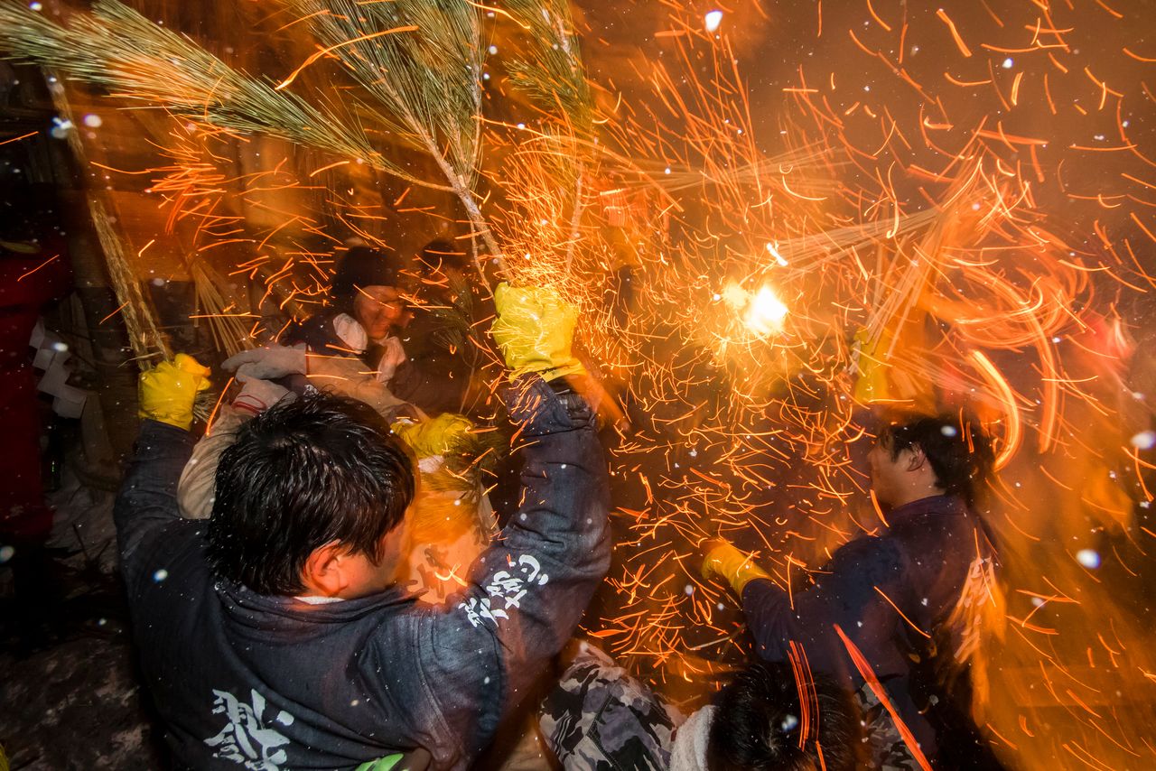 松明を持った村人たちが社殿に向かって突進し、それを厄年(25歳・42歳)の男たちが押し返す儀式です。