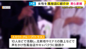 大手ニュースサイトによると、スカウトグループ「トラス」は10人ほどで活動するスカウトグループで、北新地やミナミの路上などで女性に声をかけ、性風俗店やキャバクラで働くよう勧誘していたということです。