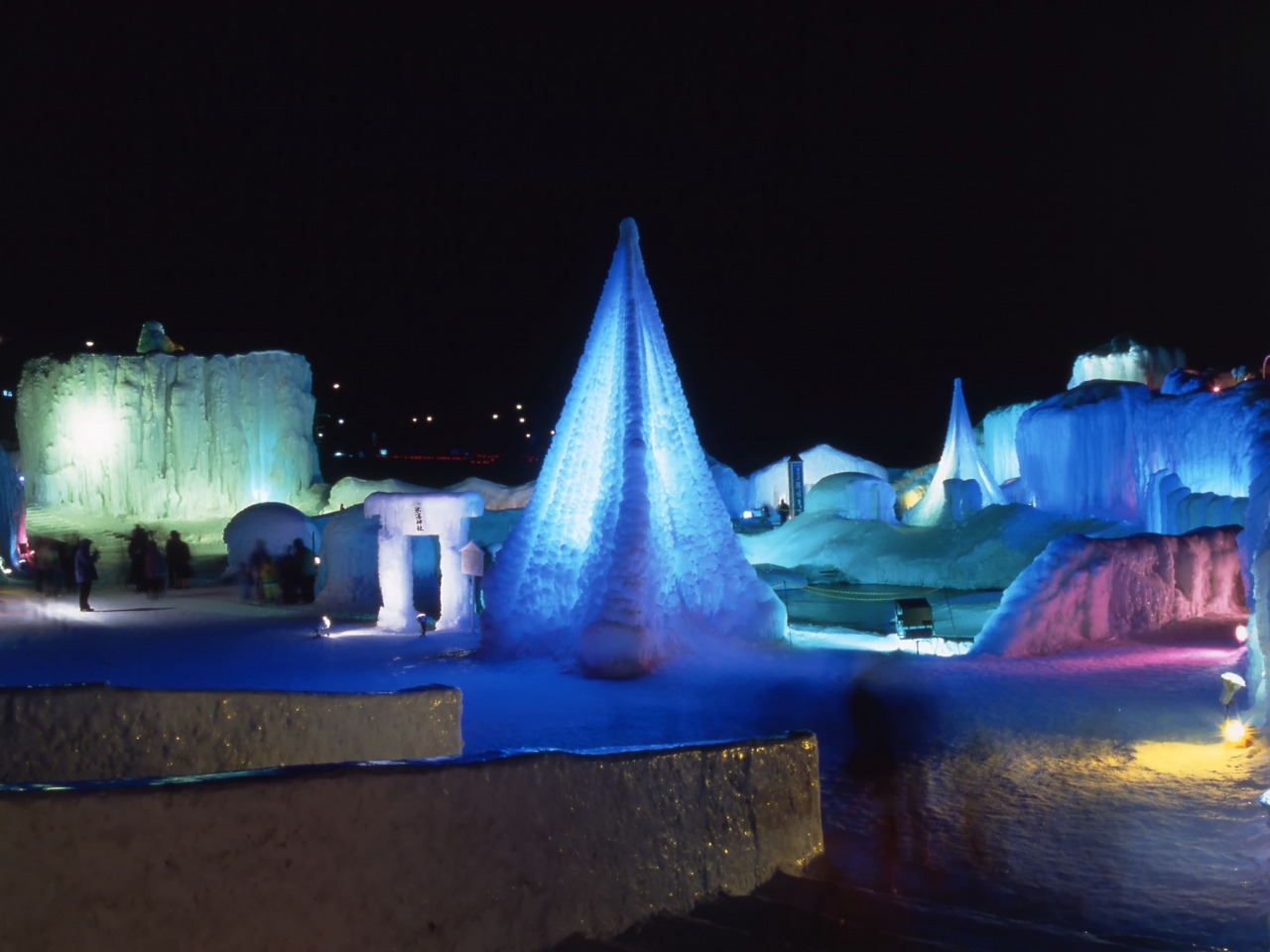 高さ数メートル級の巨大な氷の建造物が内部からライトアップされる光景は、輝く宝石のように見え、他のイルミネーションとはひと味違った美しさを楽しむことができます。