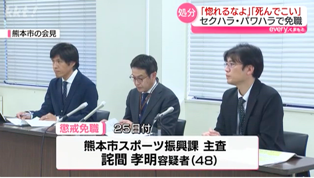 2025年12月25日、部下の女性をホテルの部屋に連れ込み抱きつこうとするなど、複数のセクハラやパワハラを行った疑いで熊本市スポーツ振興課に所属する詫間孝明容疑者(48)が逮捕されました。